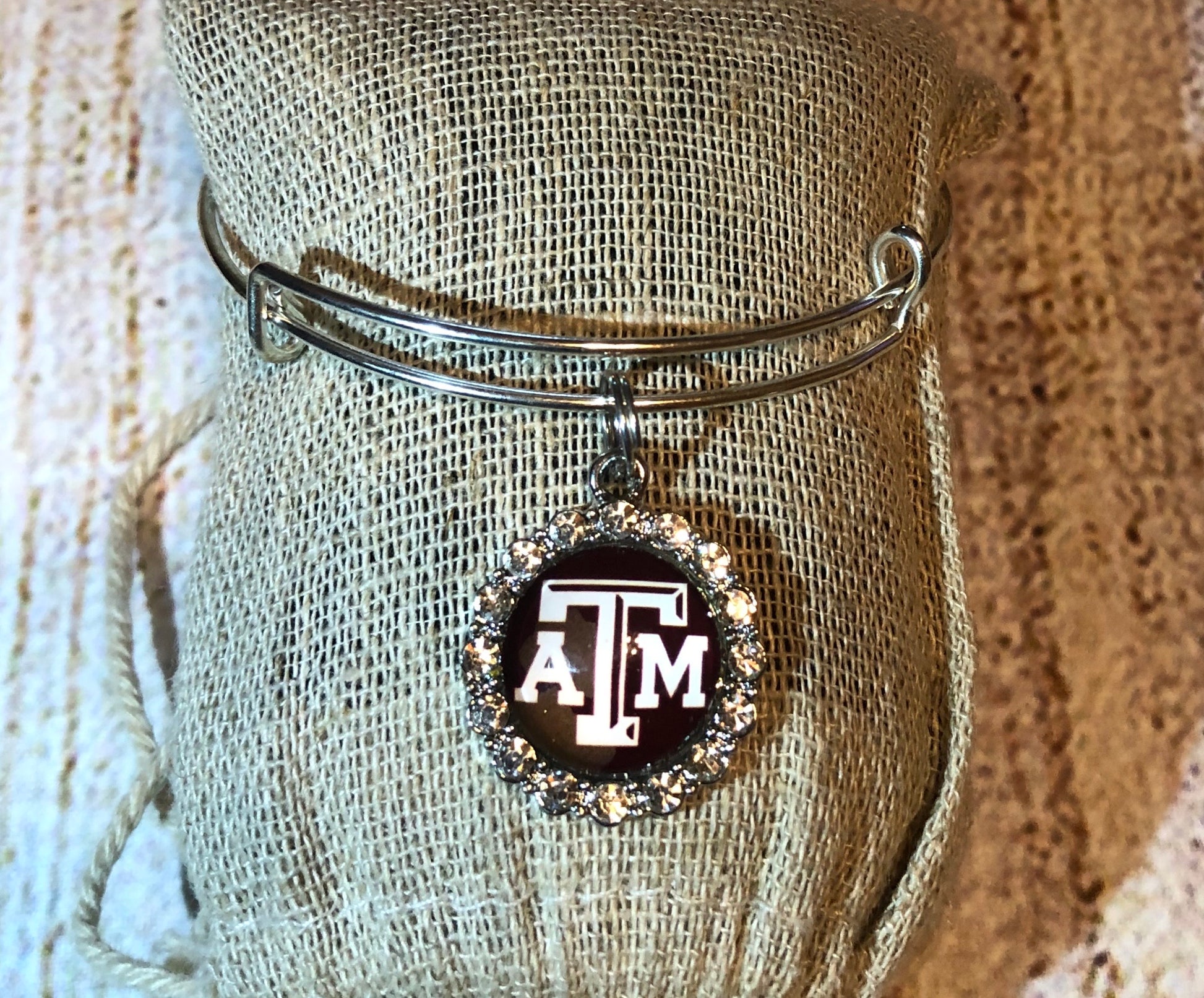 Texas A&M Charmed Bangle Bracelets Adjustable Wire Bracelets Silver with Football Charm