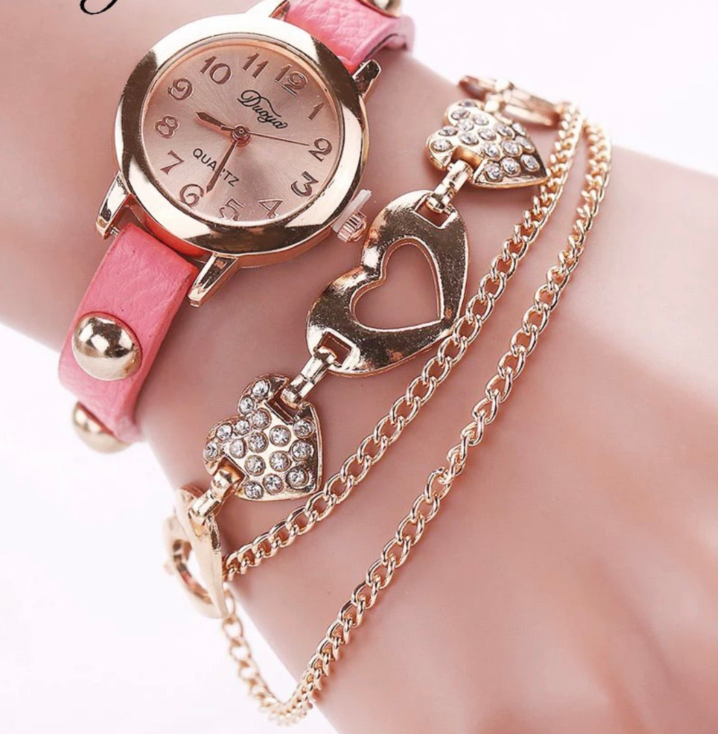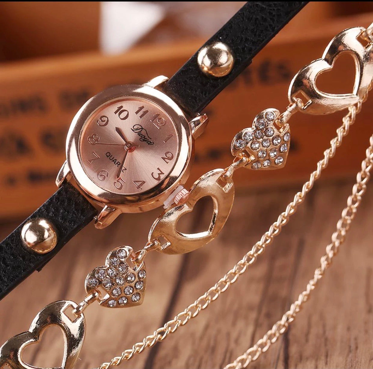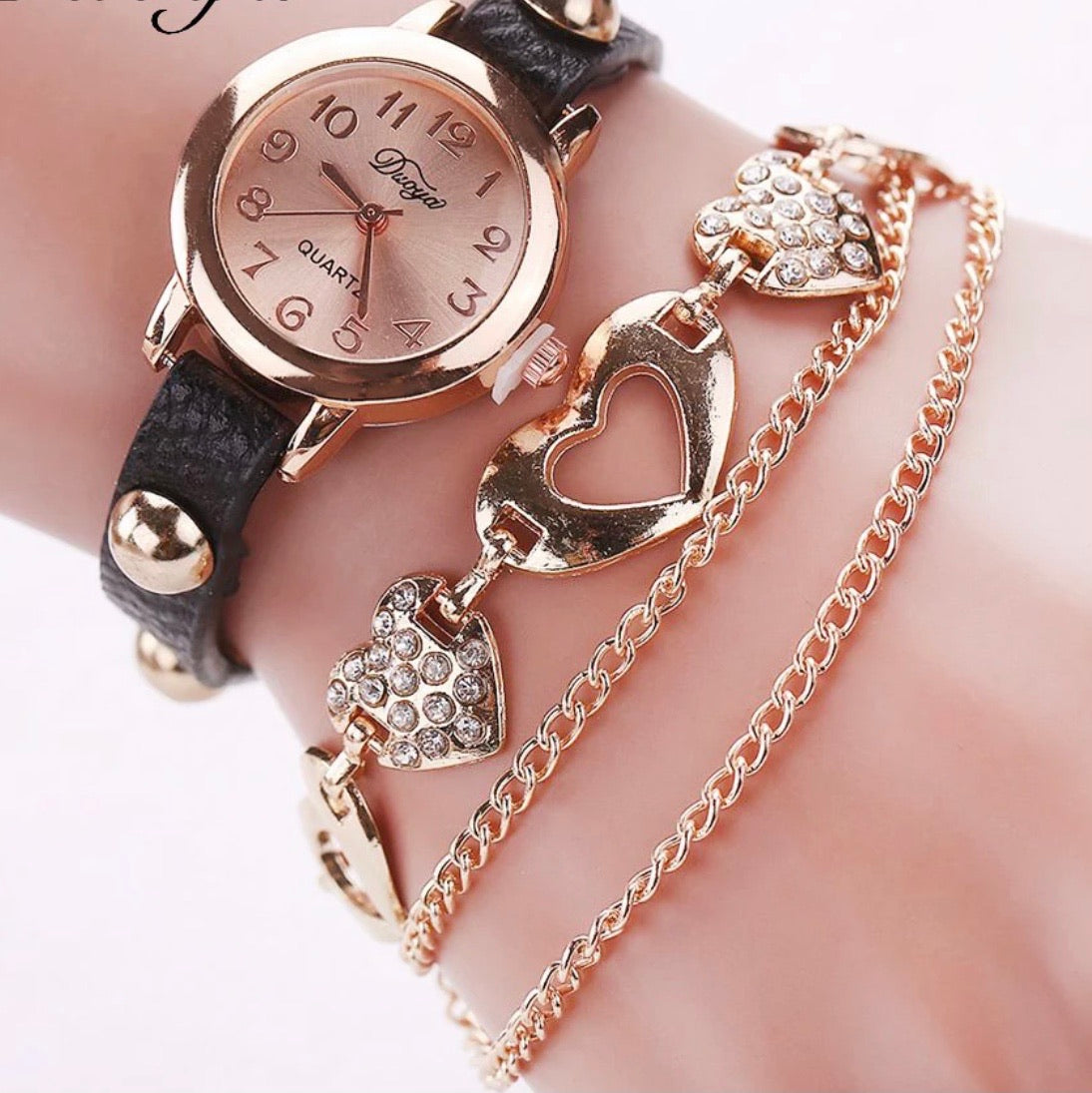 Crystal Round Luxury Watch with Double Heart Gold Bracelet