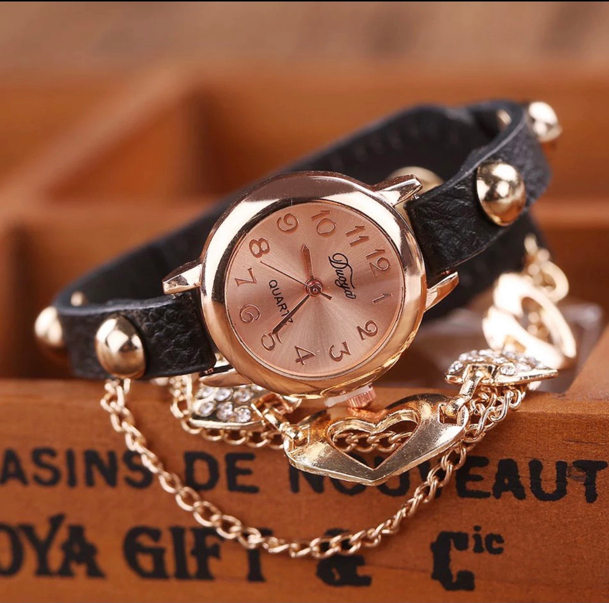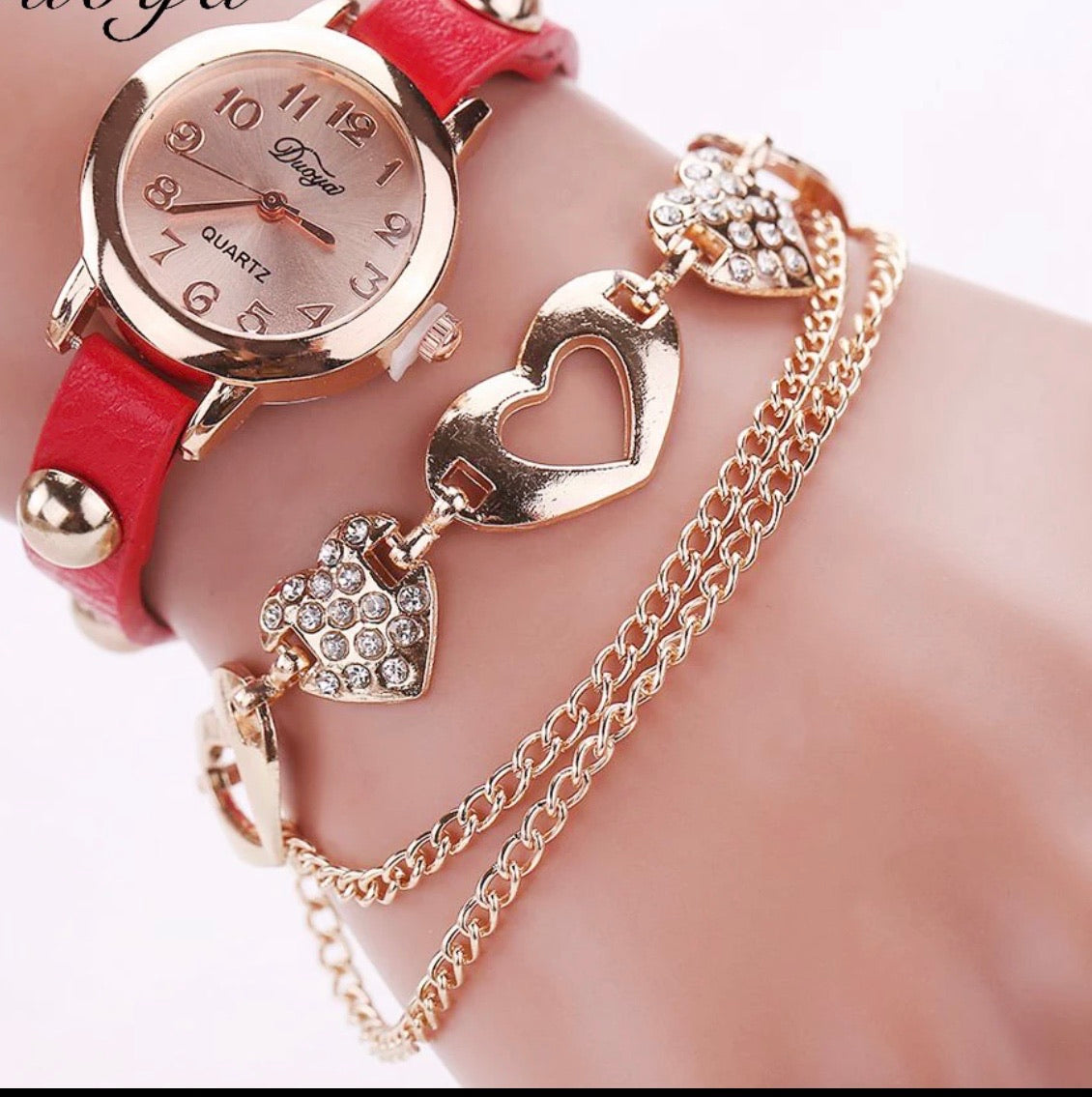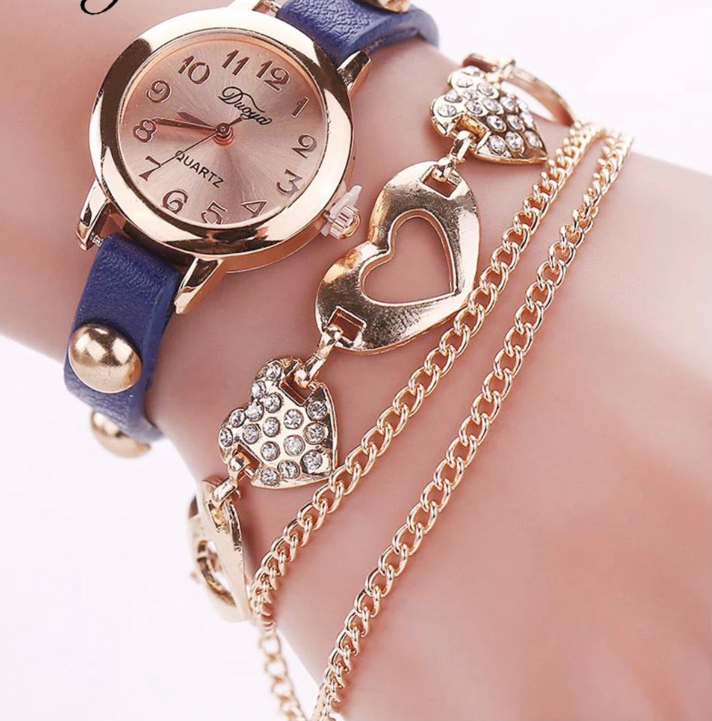 Crystal Round Luxury Watch with Double Heart Gold Bracelet