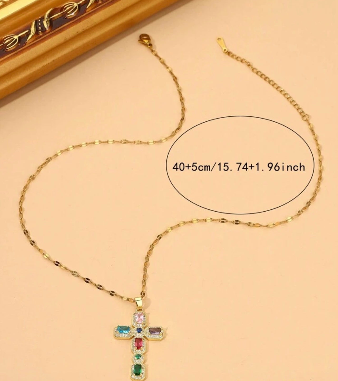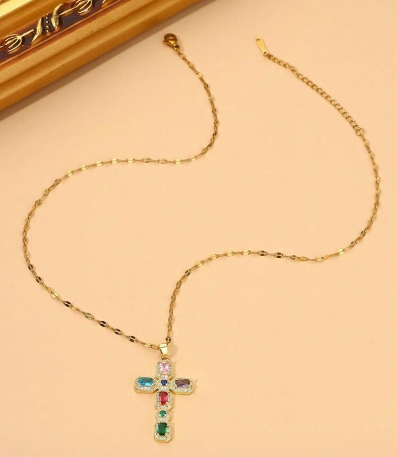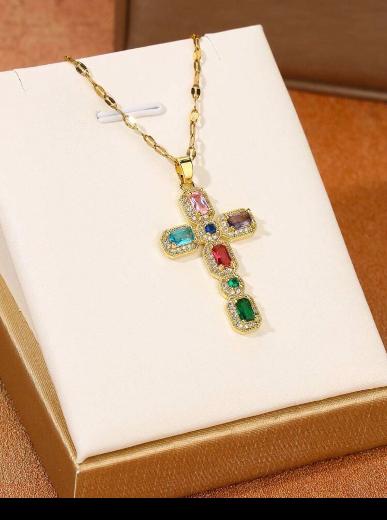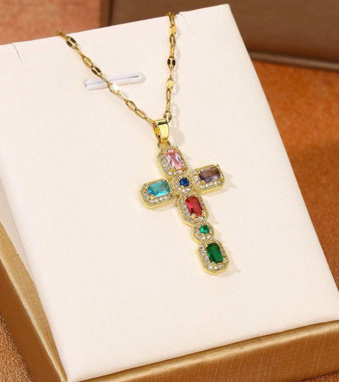 Elevate your style with our Gem Cross necklace. Crafted with stunning gemstones and a gold chain, this statement piece is a symbol of faith and beauty. Perfect for any occasion, this stylish necklace adds an elegant touch to any outfit. Show off your faith with this must-have accessory.
